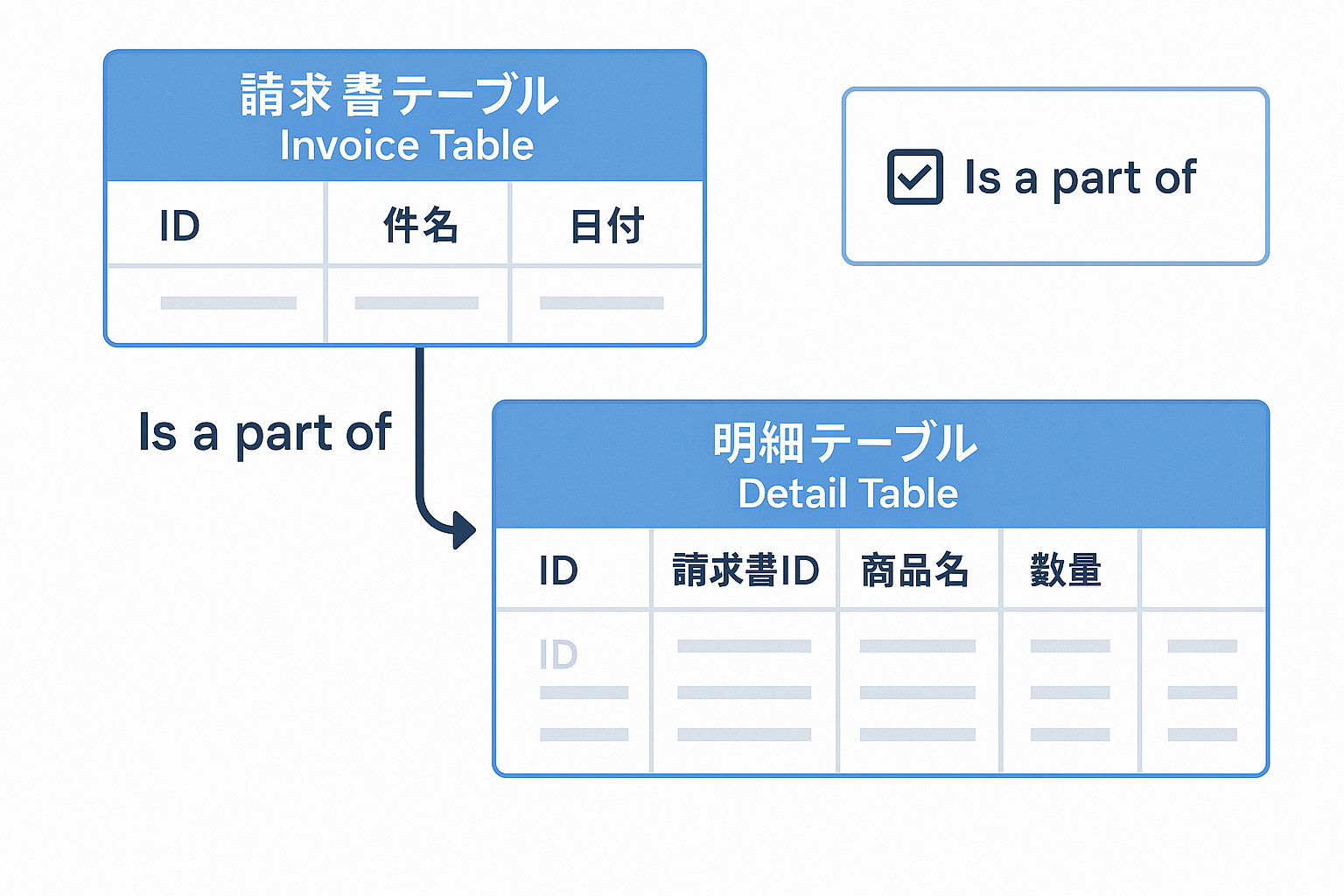 上の図のように、「明細」テーブルのRef列で「Is a part of」を有効にすることで、「明細」が「請求書」の一部であることを示します。