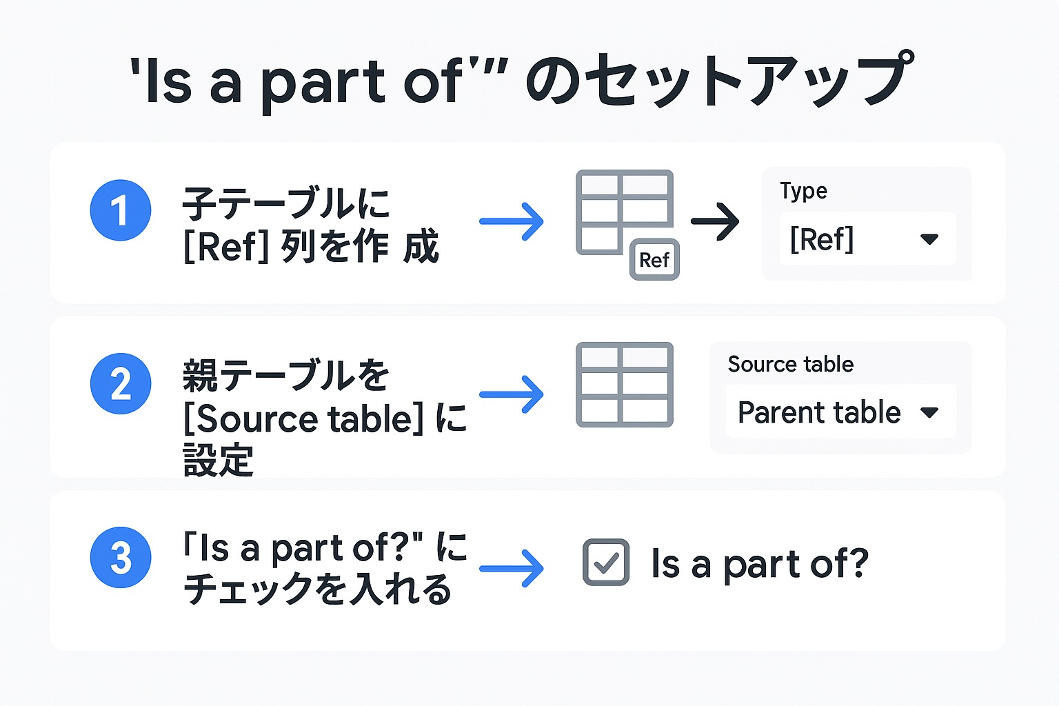 Refがテーブル間の「関連付け」を行う機能であるのに対し、「Is a part of」は、その関係性をさらに一歩進め、テーブル間に「所有関係」や「親子関係」を定義するための機能です。