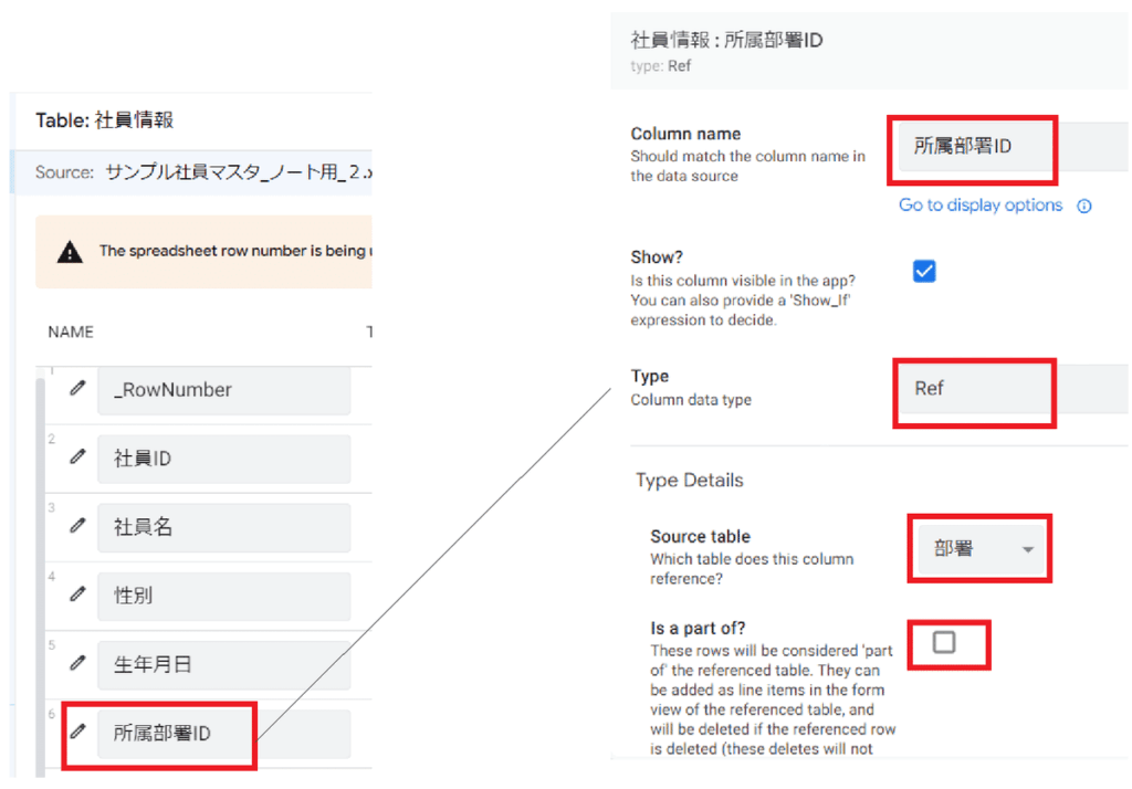 Ref列の設定項目の一つである「Is a part of」を有効にすることで、一方のテーブルのデータが、もう一方のテーブルのデータの一部である、ということをAppSheetに認識させることができます。